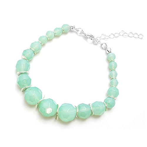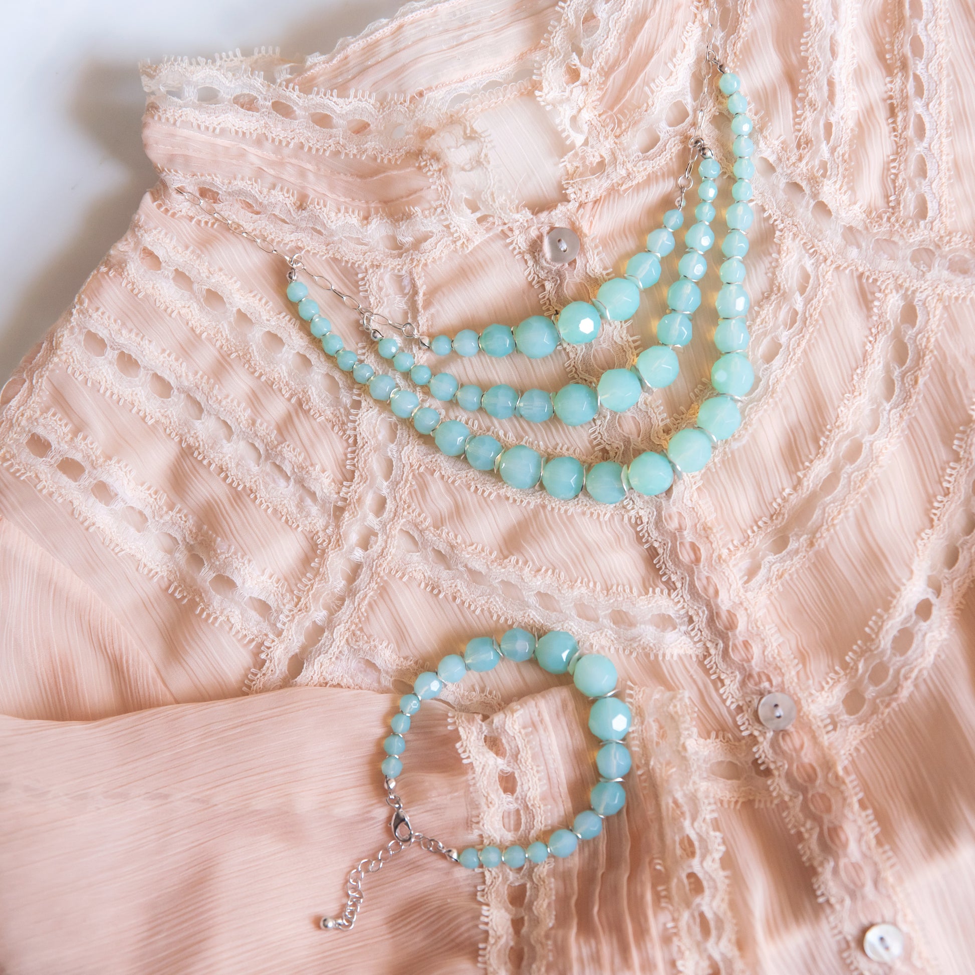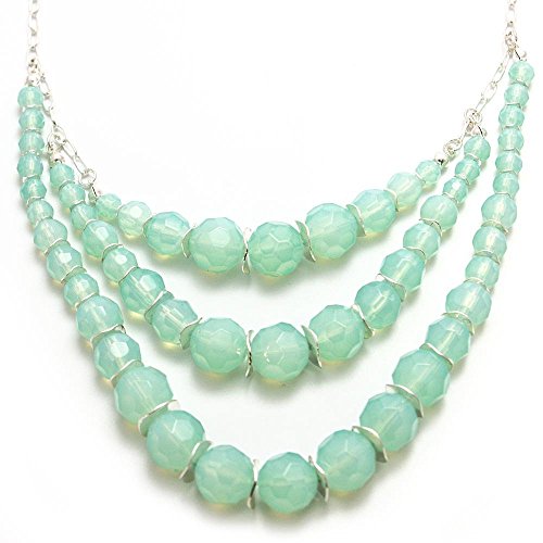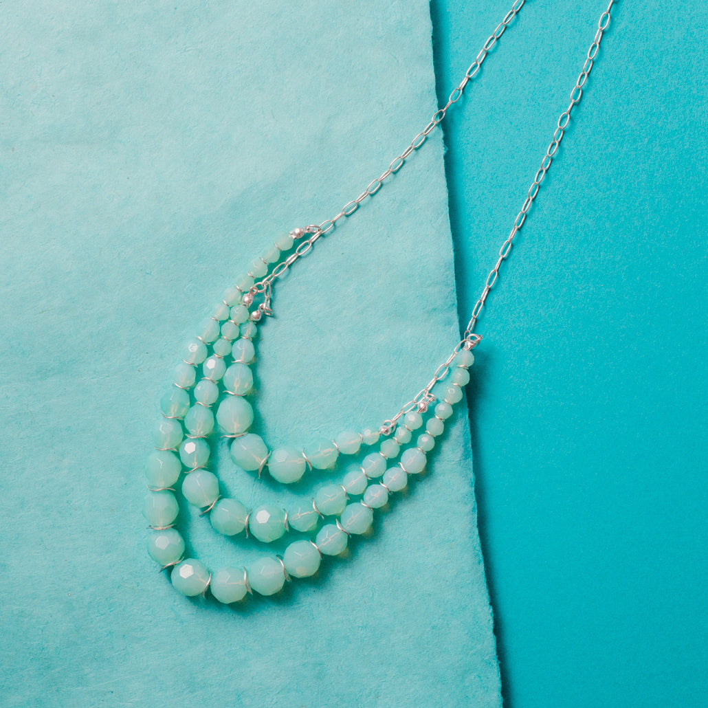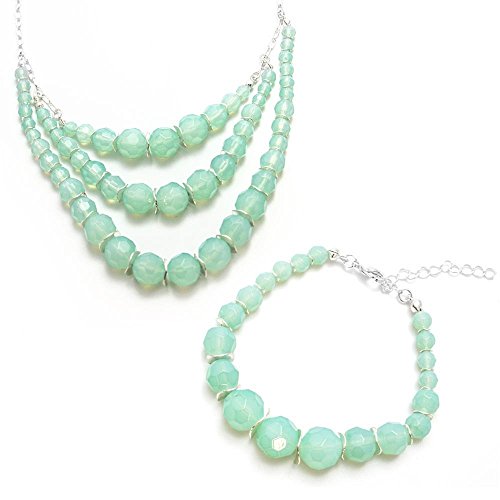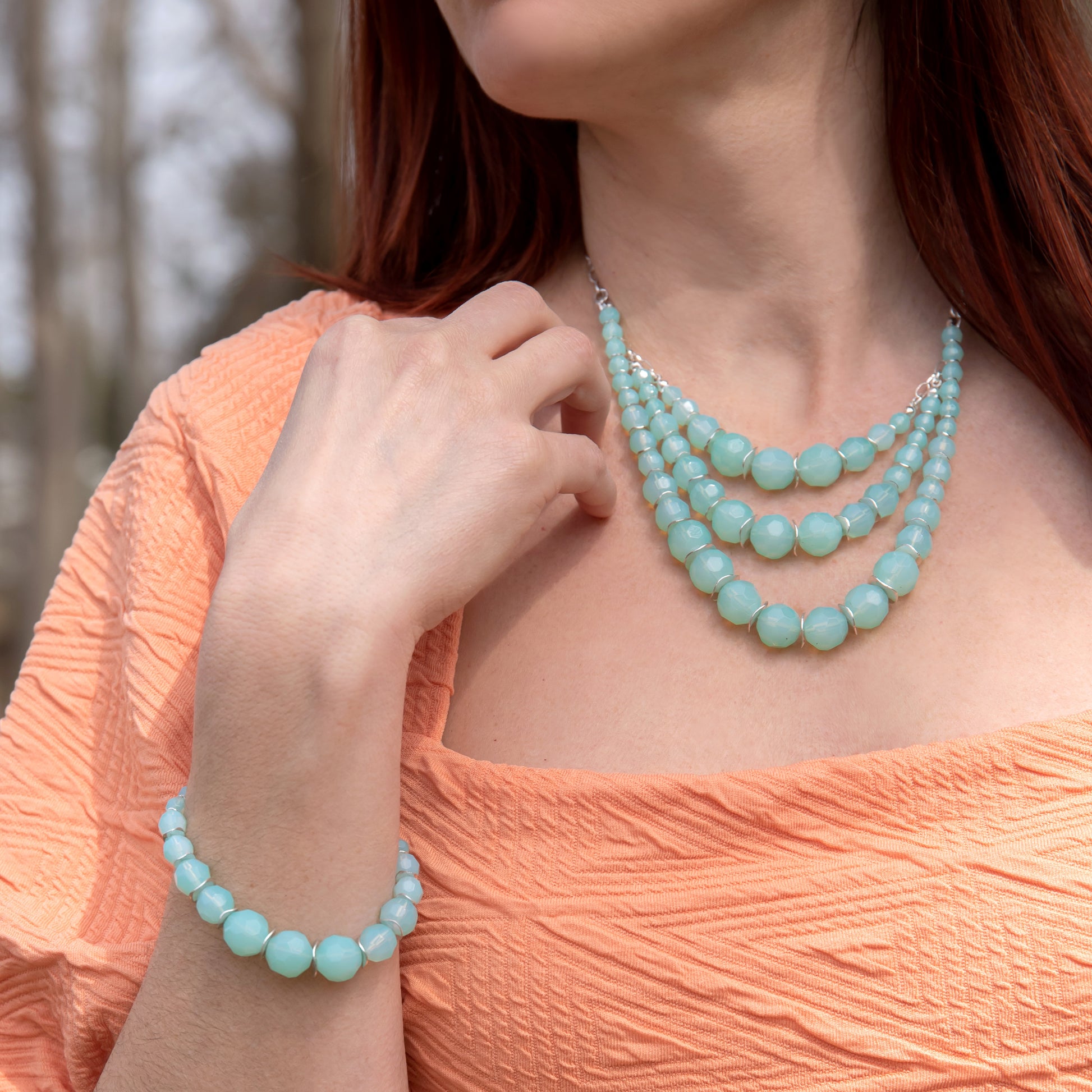 Elegant 3-Strand Mint Green Faceted Glass Bead Necklace and Bracelet Set with Silver Tone Chain