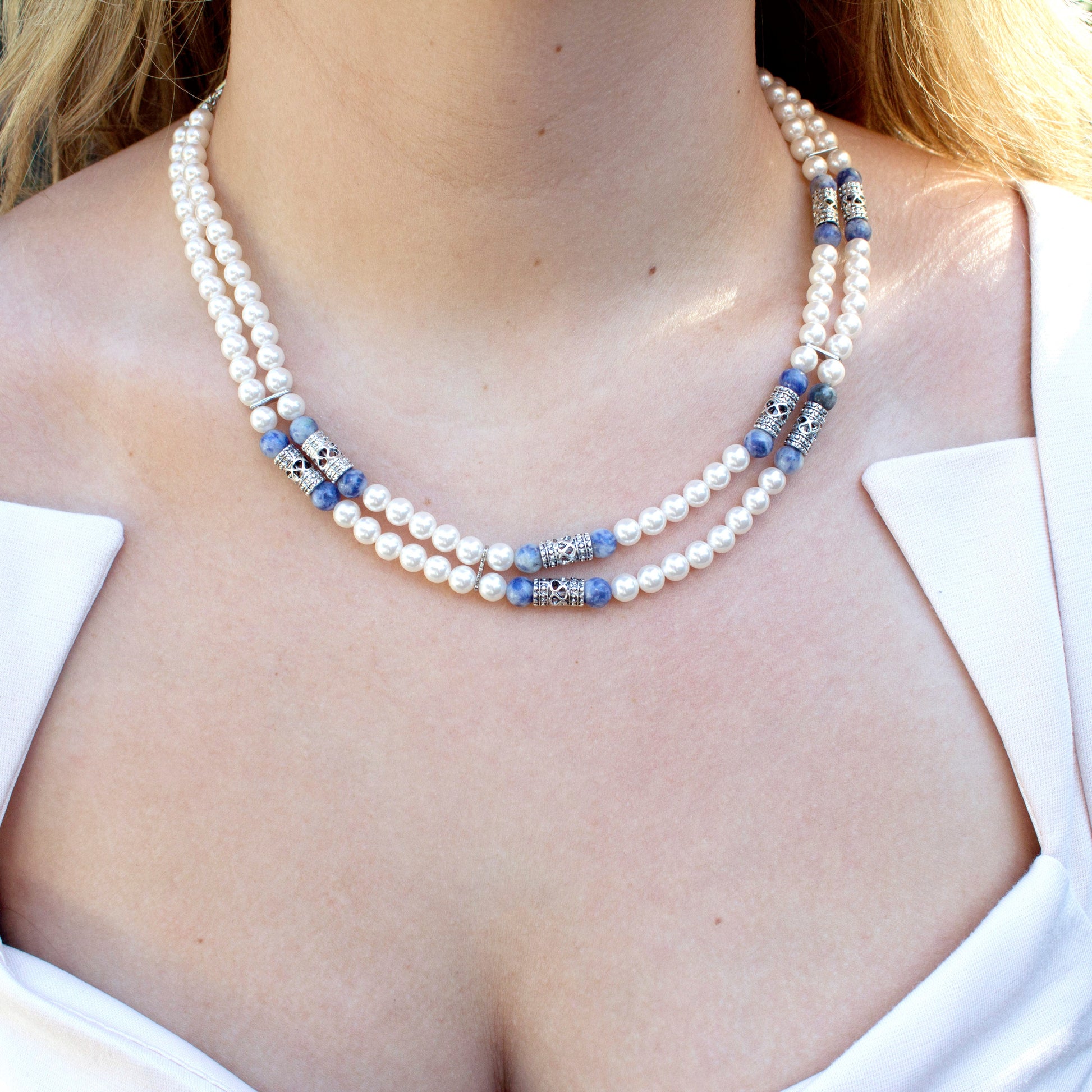 Elegant Double Strand Pearl and Genuine Lapis Necklace with Silver Tone Accents