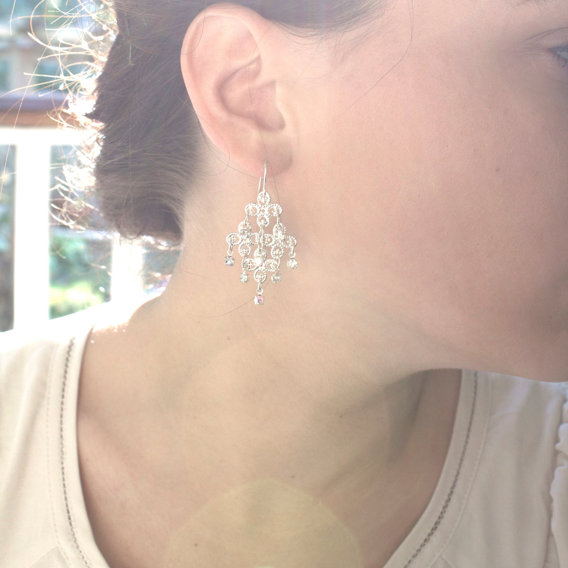 Elegant Crystal Chandelier Drop Earrings with Austrian and Aurora Borealis Crystals - Silver Tone