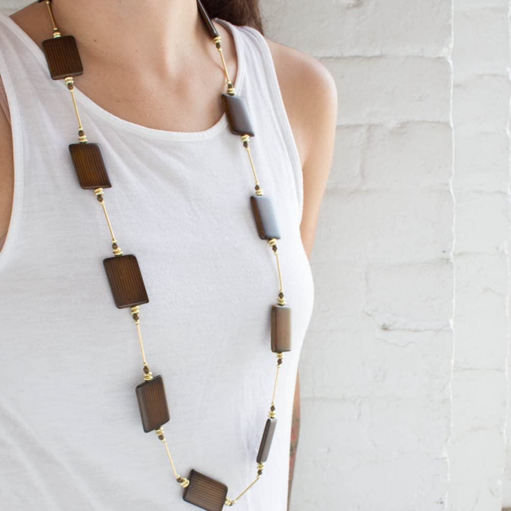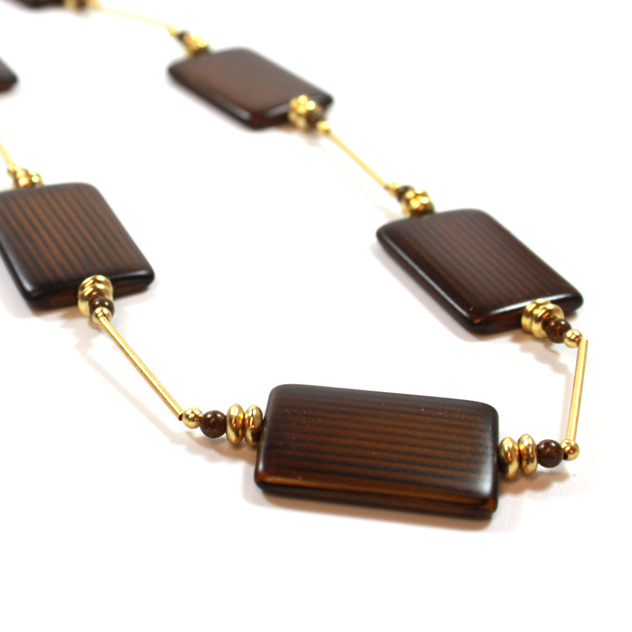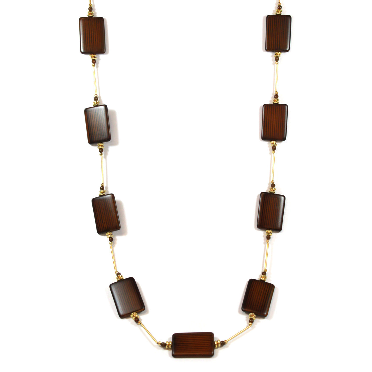 36 Inch Brown Wood Bead Station Necklace with Gold Tone Accents