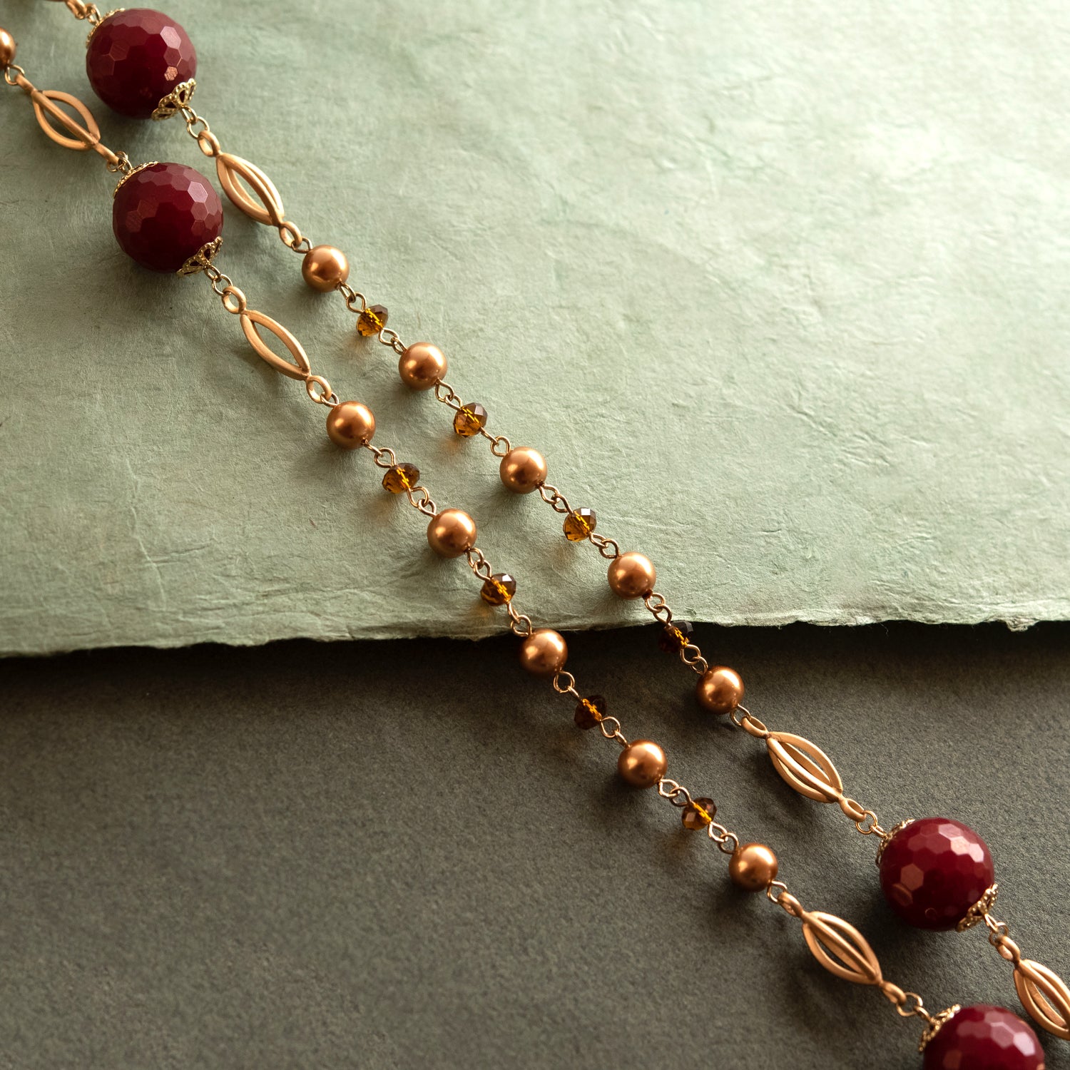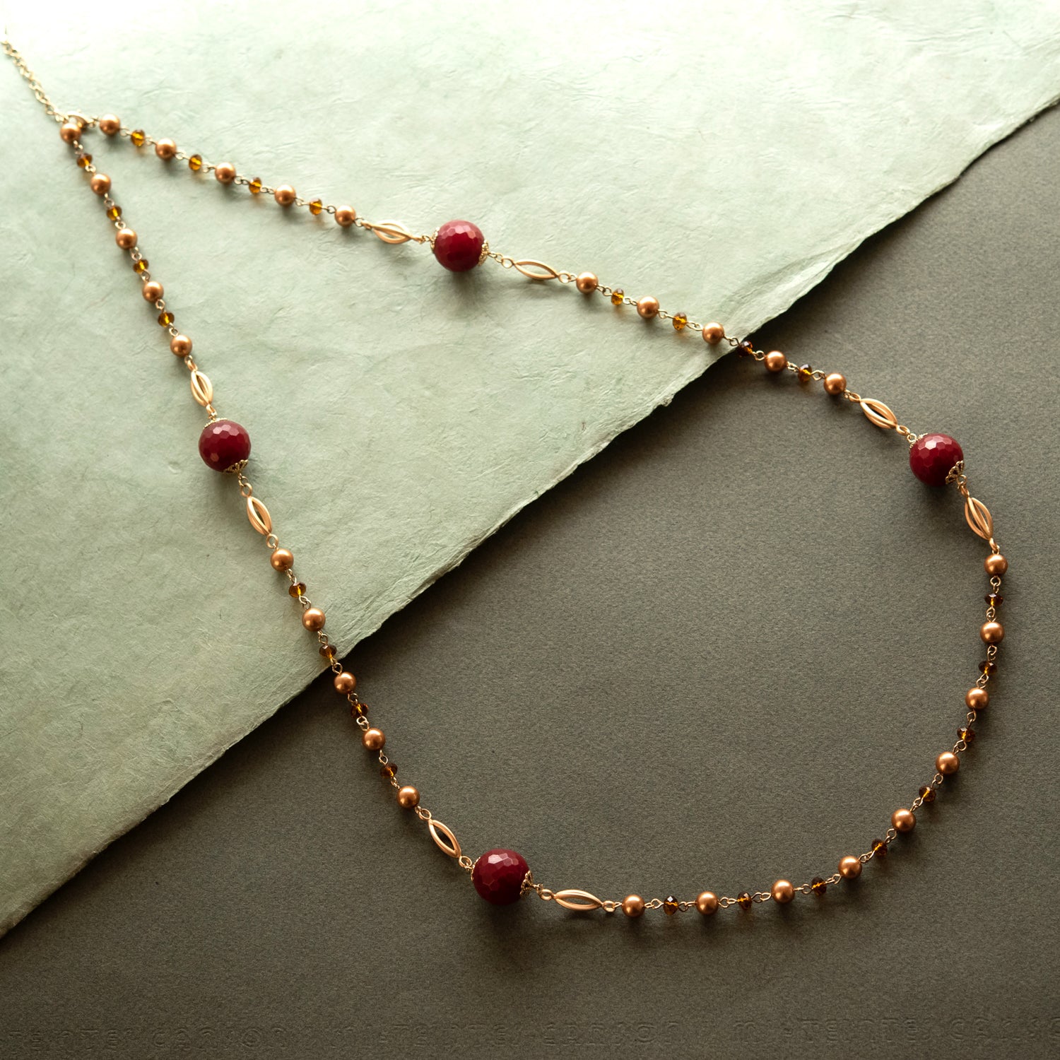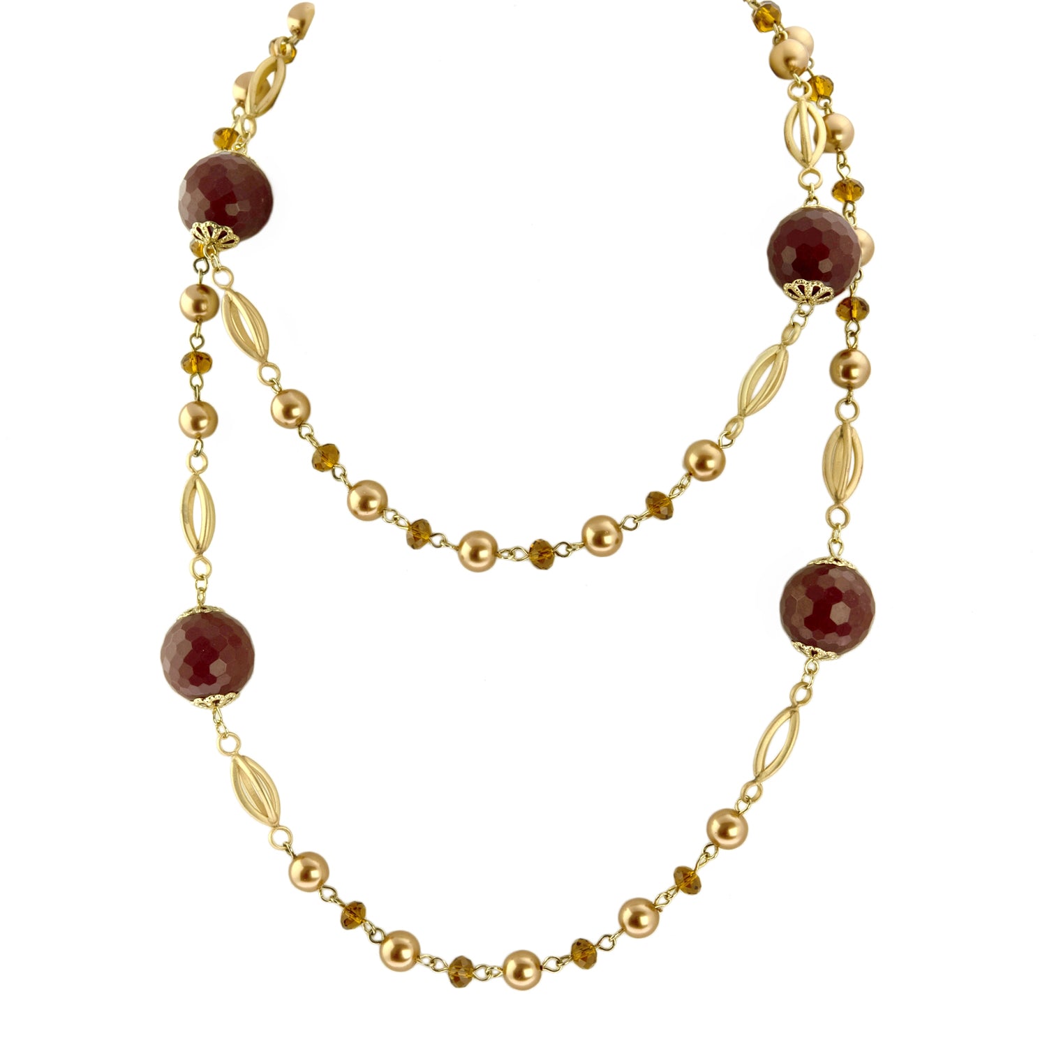 Elegant Long Red Jade and Topaz Crystal Station Necklace with Gold Tone Beads, 38 Inches