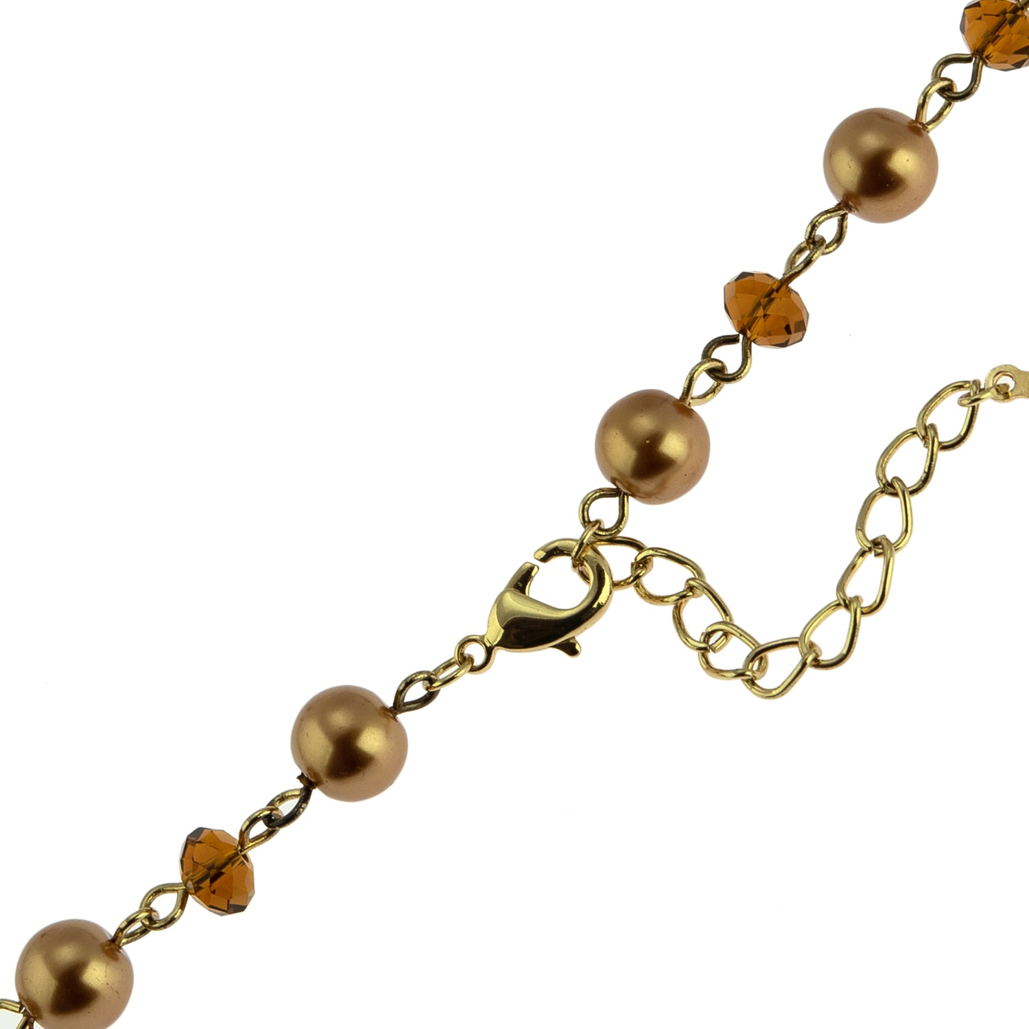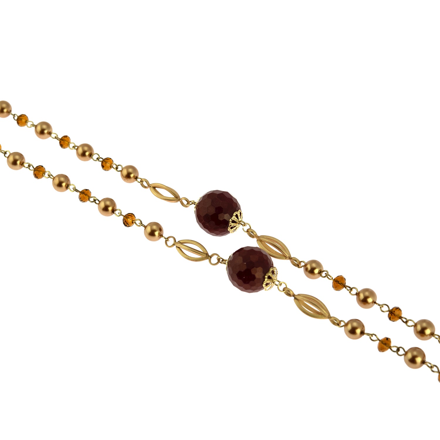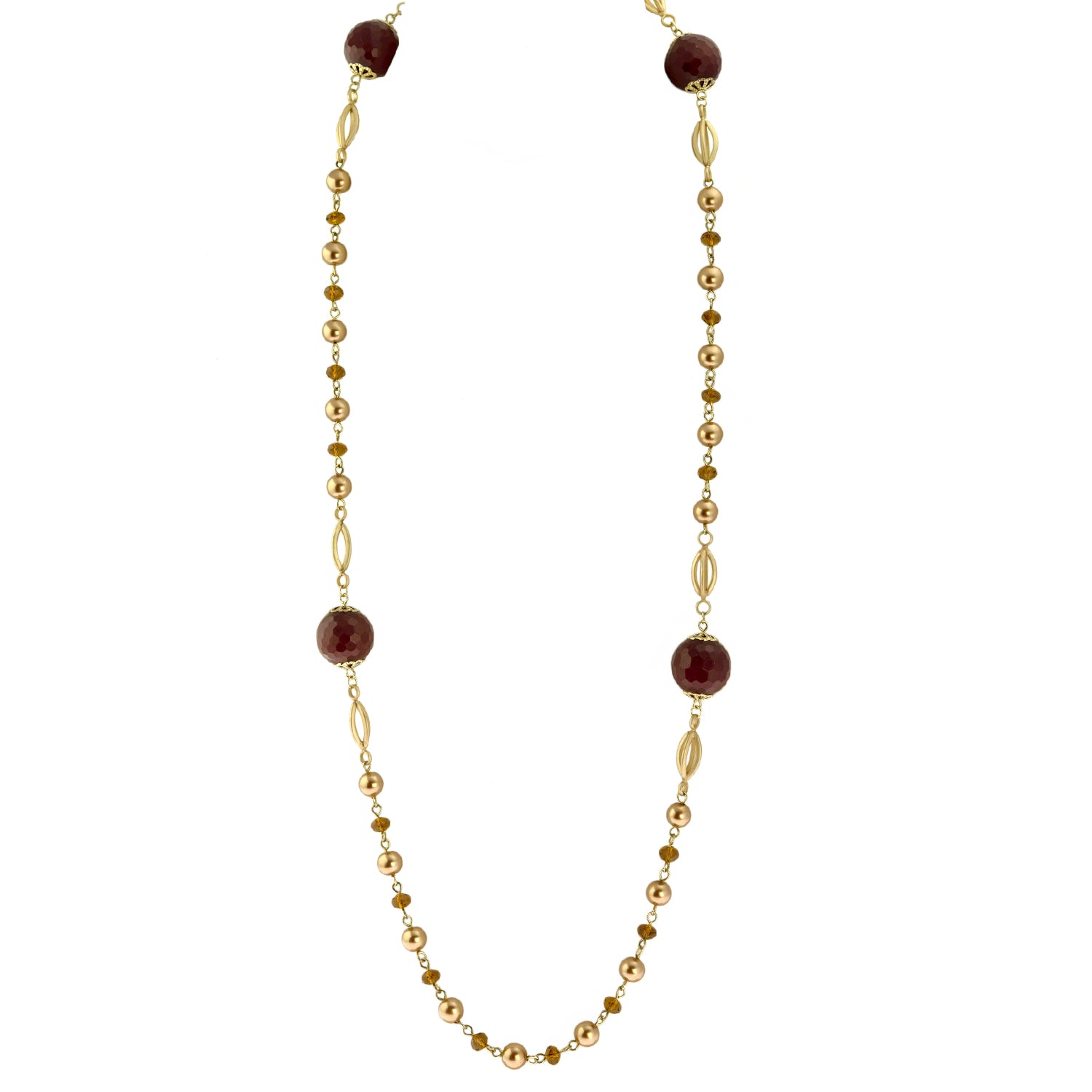 Elegant Long Red Jade and Topaz Crystal Station Necklace with Gold Tone Beads, 38 Inches